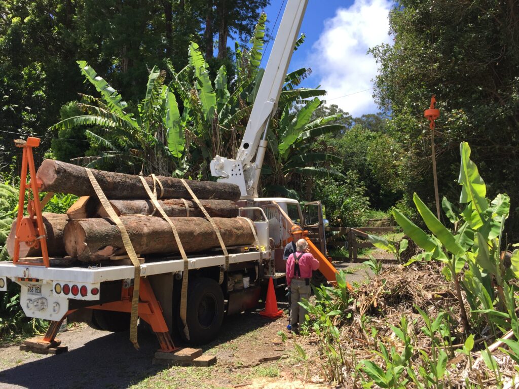 (Above) Our crane with four 2-ton logs onboard; we transport logs for sawmills also.